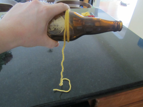 Uma vez que você tenha o circulo de barbante, retire-o da garrafa, embebede-o na tijela com fluido e depois volte-o na garrafa na altura que você que seu copo.