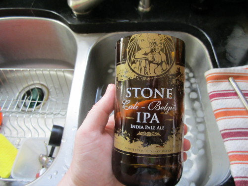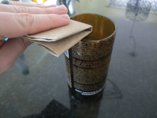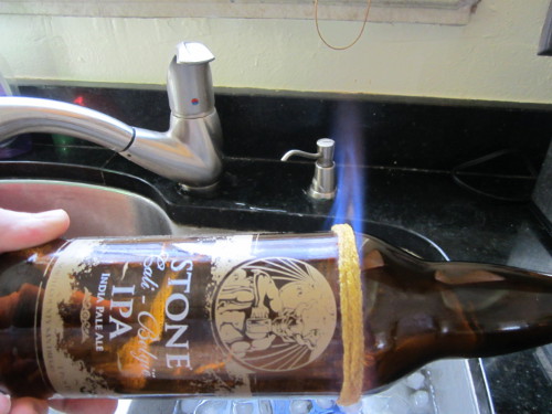 Quando o fogo estiver se extinguindo e a garrafa já estiver quente (sinta-a), mergulhe a mesma na pia com gelo (para dar um choque térmico) depois retire-a com cuidado.