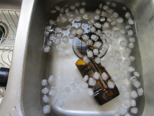 Encha a pia com um pouco de água e com o gelo, o suficiente para cobrir o diâmetro da garrafa deitada.